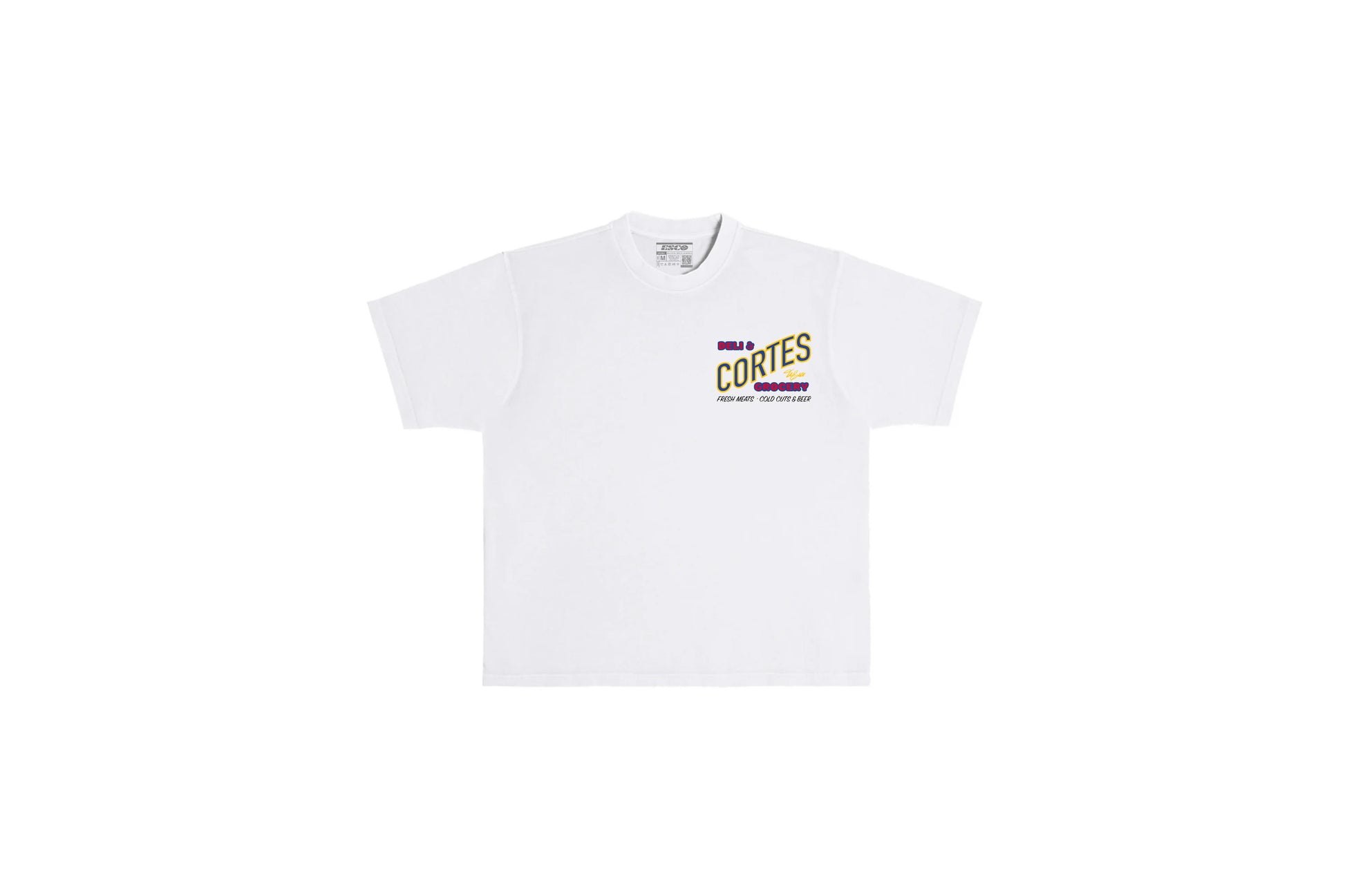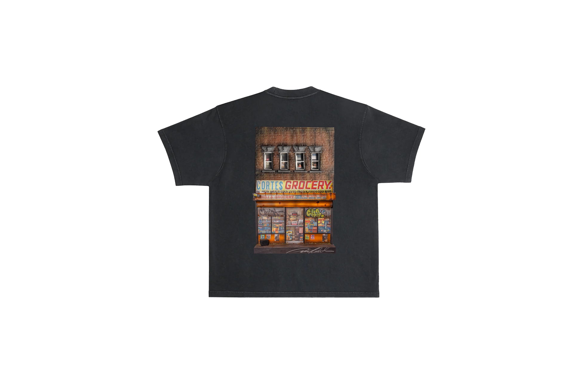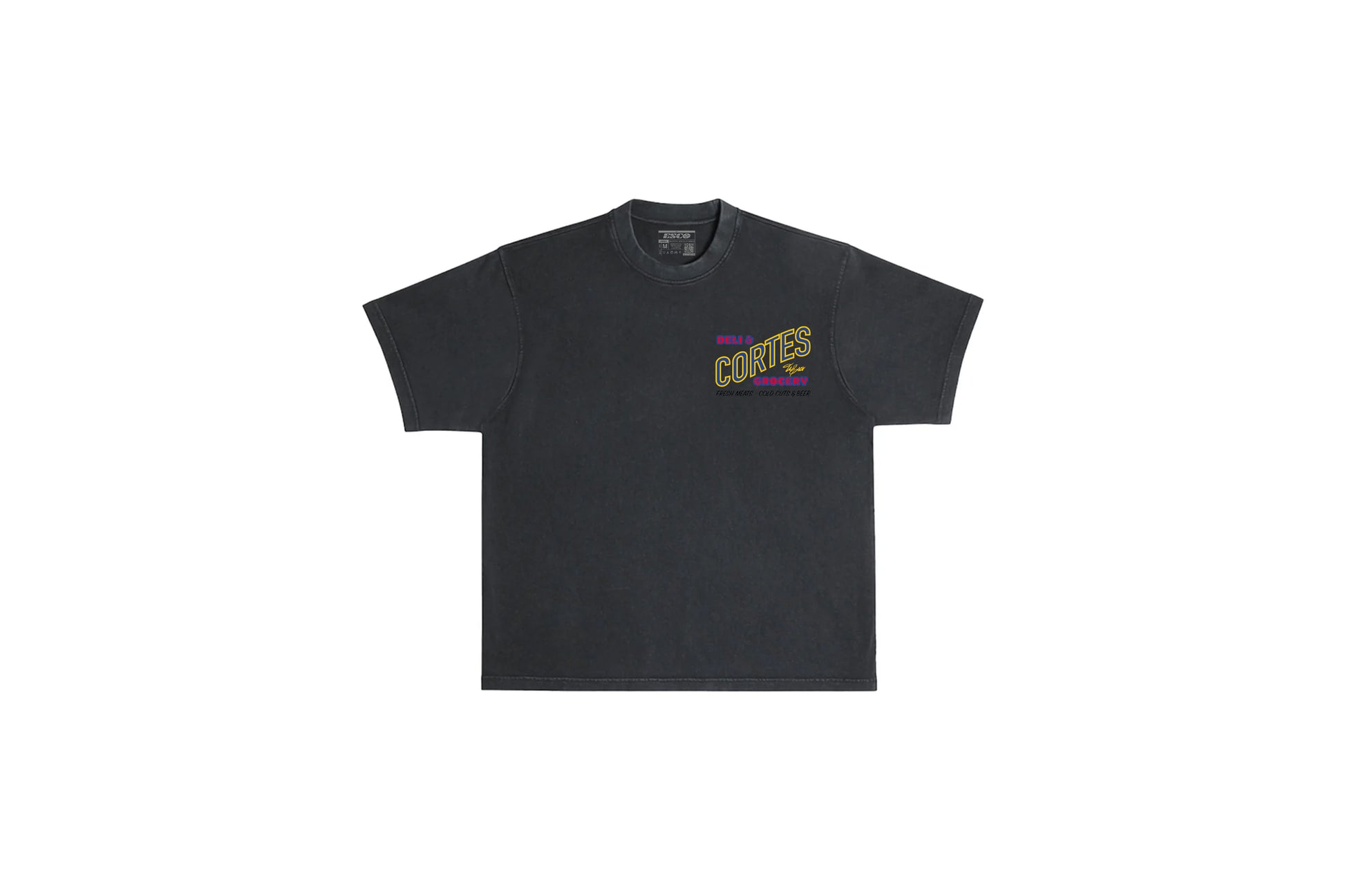 This Cortes Bodega NYC piece highlights the city's well-known scenes. The renowned Cortes Bodega offers a heavy-duty washed t-shirt with an inverted design, featuring a precise depiction of the store on the front left chest print.