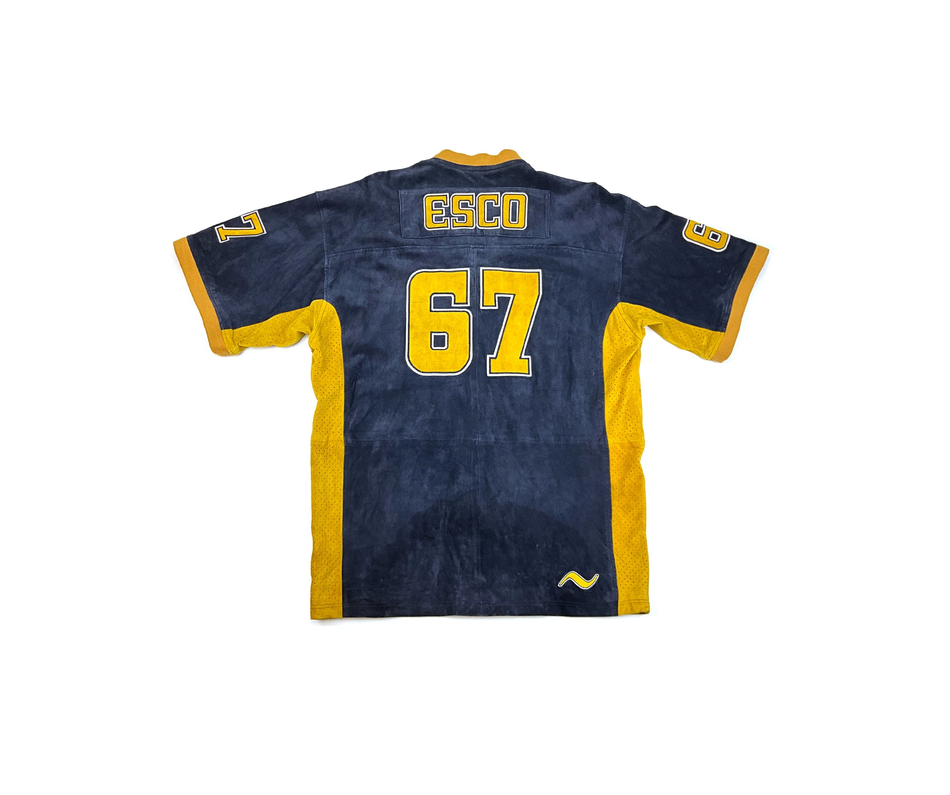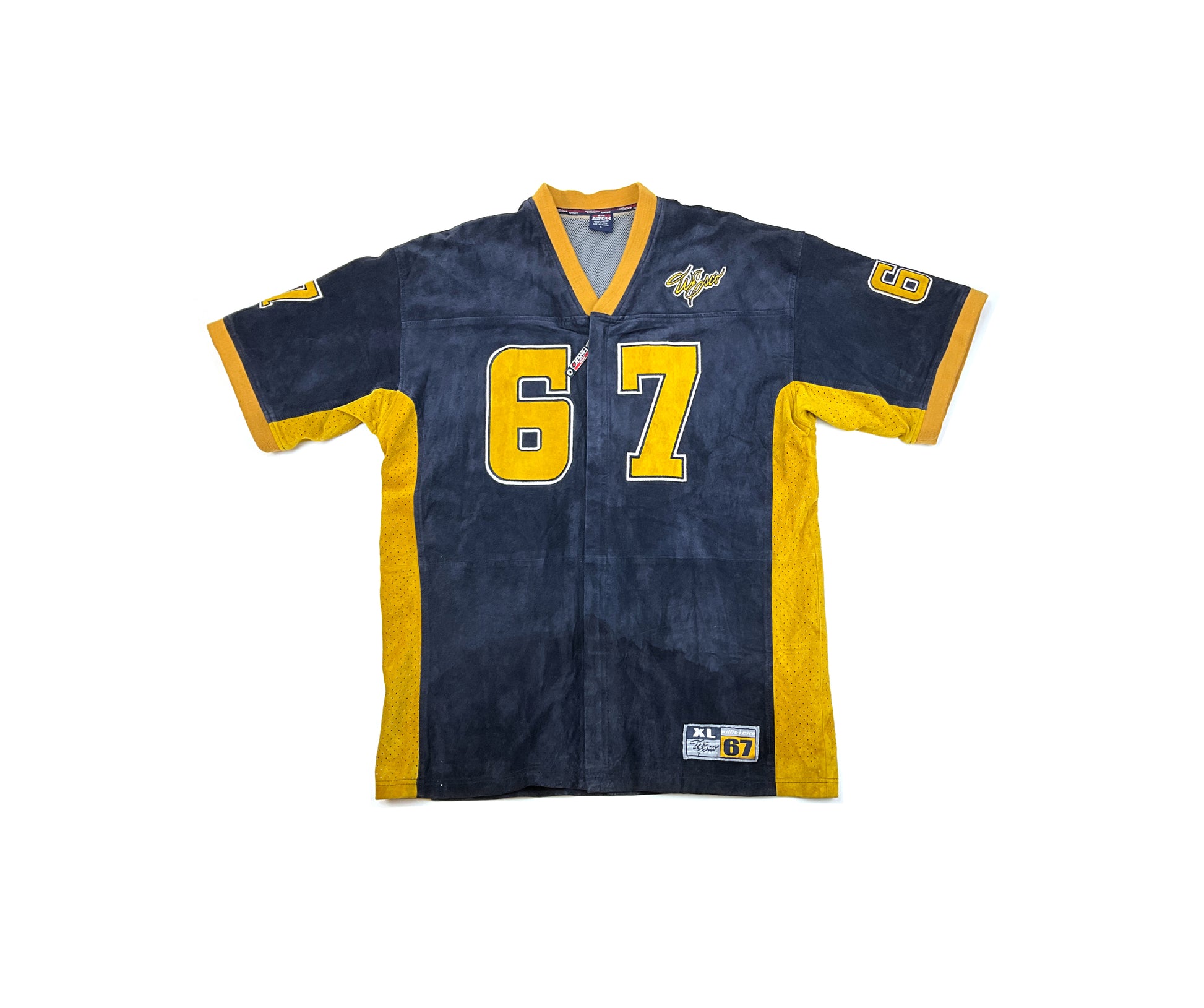 Effortlessly released in 2000, this innovative reinterpretation of the iconic American Football Jersey features a modernized touch with a functional zipper, providing unparalleled convenience. Made with top-quality suede, the jersey exhibits a refined v-neck design and expertly-crafted mesh sections for exceptional breathability and amplified comfort.